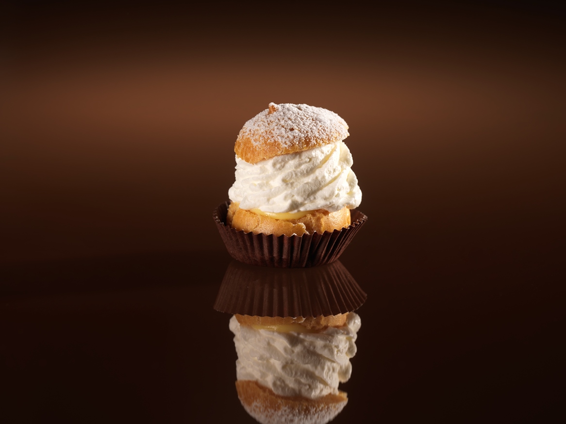Una nuvola di panna montata racchiusa in due parti di pasta chuox, sulla base un filo di crema pasticcera a renderla piu’ golosa; il tutto spolverato con zucchero a velo