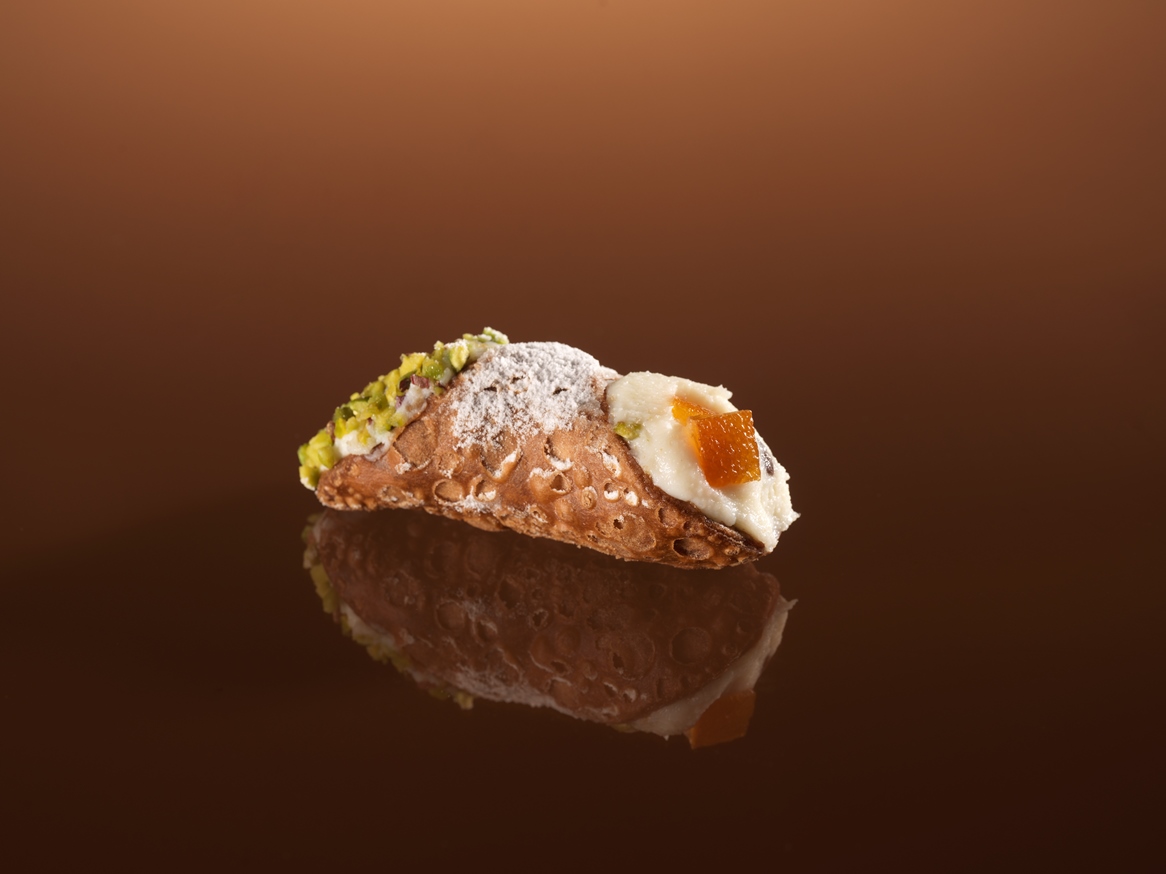 Ricotta arricchita da pepite di cioccolato fondente, avvolta in una croccante cialda di cannolo, rifinita alle estremità con granella di pistacchio e cubetti di scorza di arancia
