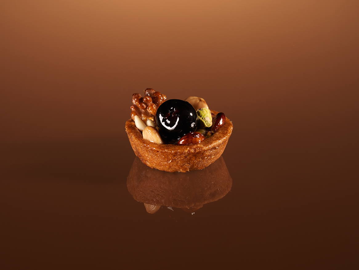 Un mix di frutta secca adagiato su un velo di marmellata, racchiuso in un maxi frollino di pasta frolla