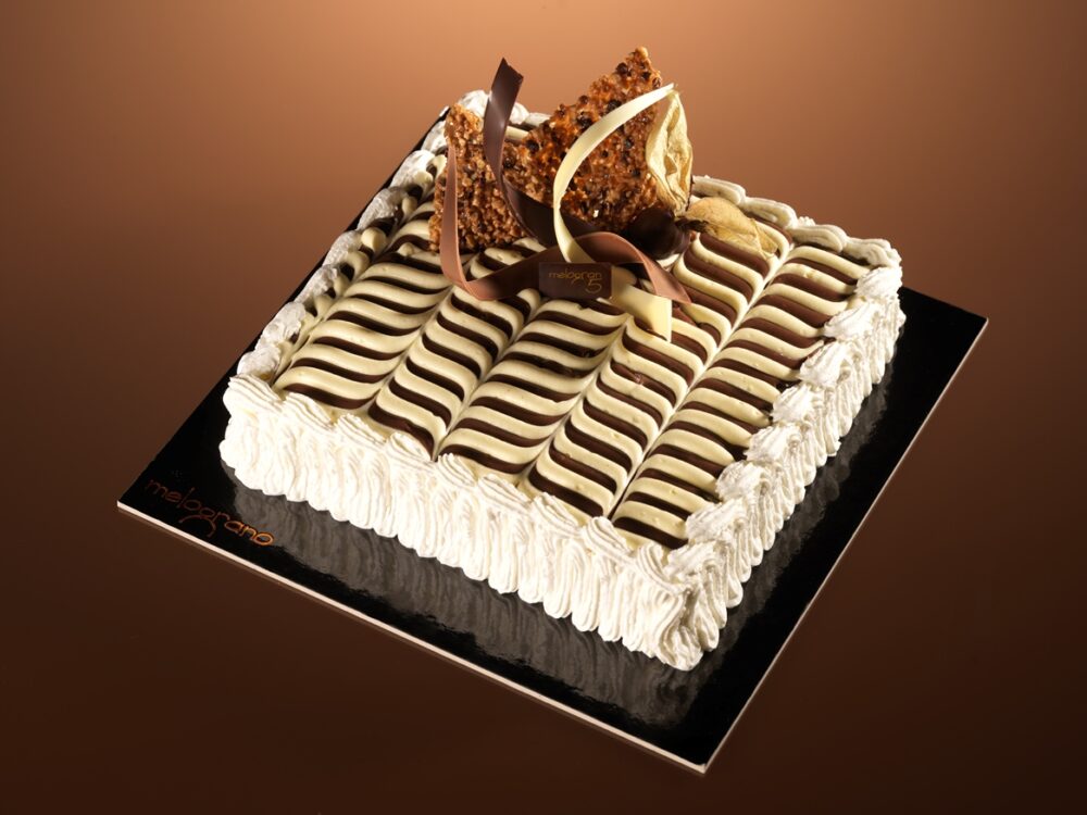 Morbida e cremosa torta con pan di spagna, arricchita da ciuffi di panna montata e meringhette ai lati e con una ricca decorazione diagonale; una delizia sia per la vista che per il gusto
