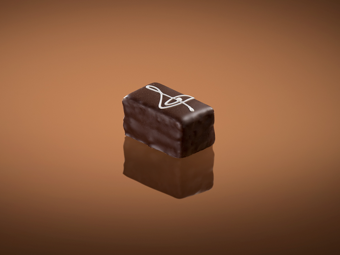 La fragrante copertura di cioccolato fondente che contrasta la morbidezza di cioccolato e un fine pan di spagna alle mandorle