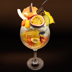 Macedonia tropicale con: mango, papaja, ananas e banana con succo di lime. Gelato: cocco variegato ananas, mango/lime, vaniglia. Panna montata. Decorazione con: biscotto, riccioli di cioccolato fondente, marchietto Melograno. Fetta di cocco, passion fruit, fetta di lime, mix tropicale.