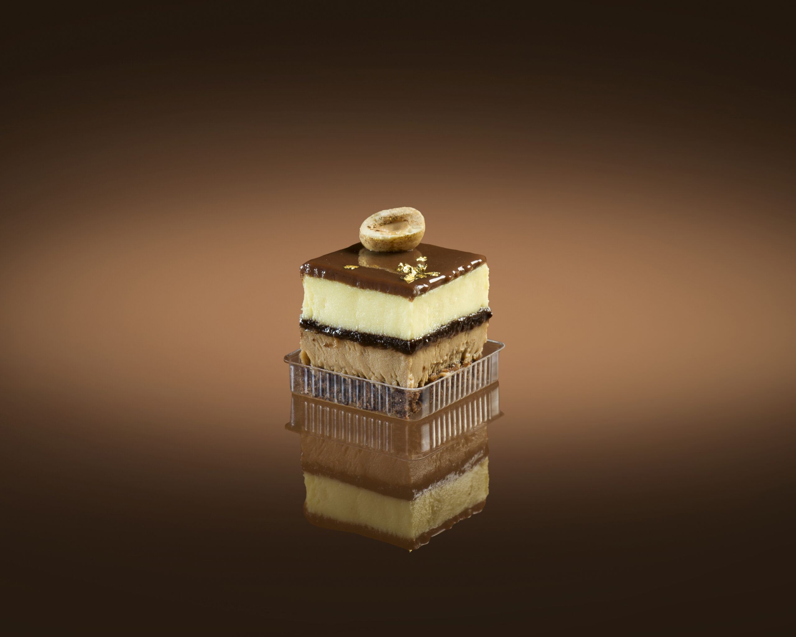 mousse cioccolato gianduia: (LATTE, tuorlo D’UOVO, zucchero, gelatina alimentare, acqua, PANNA 38%, cioccolato gianduia: (zucchero, pasta di NOCCIOLE, burro di cacao, pasta di cacao, emulsionante lecitina di SOIA, aroma naturale vaniglia), mousse cioccolato bianco: (LATTE, tuorlo D’UOVO, zucchero, gelatina alimentare, acqua, PANNA 38%, cioccolato bianco: (zucchero, burro di cacao, LATTE in polvere, emulsionante: lecitina di SOIA, aroma), bisquit cioccolato: (tuorlo D’UOVO, zucchero, albume D’UOVO, cacao amaro, farina senza glutine: (amido di mais, farina di grano saraceno, farina di riso, fibra di psillium, zucchero), BURRO), croccantino biscotto: (oli (girasole, palma), zucchero, frollini al cacao (zucchero, amido di frumento deglutinato, grassi (palma), emulsionante: E471; cacao in polvere, UOVA, agenti lievitanti: E450, E500; aromi, sale),NOCCIOLE, cacao in polvere, LATTE magro in polvere, siero di LATTE in polvere, emulsionante: lecitina di SOIA; aromi, sale), glassa specchio cioccolato: (acqua, zucchero, sciroppo di glucosio, LATTE, zucchero, gelatina alimentare, acqua, cioccolato fondente (pasta di cacao; zucchero; burro di cacao; emulsionante: lecitina di SOIA; aroma naturale di vaniglia))