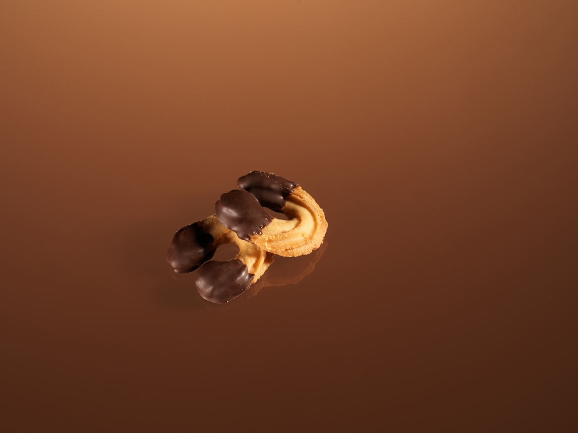 Delicata pasta morbida a forma di ferro di cavallo, arricchita sulle punte da gustoso e fragrante cioccolato fondente
