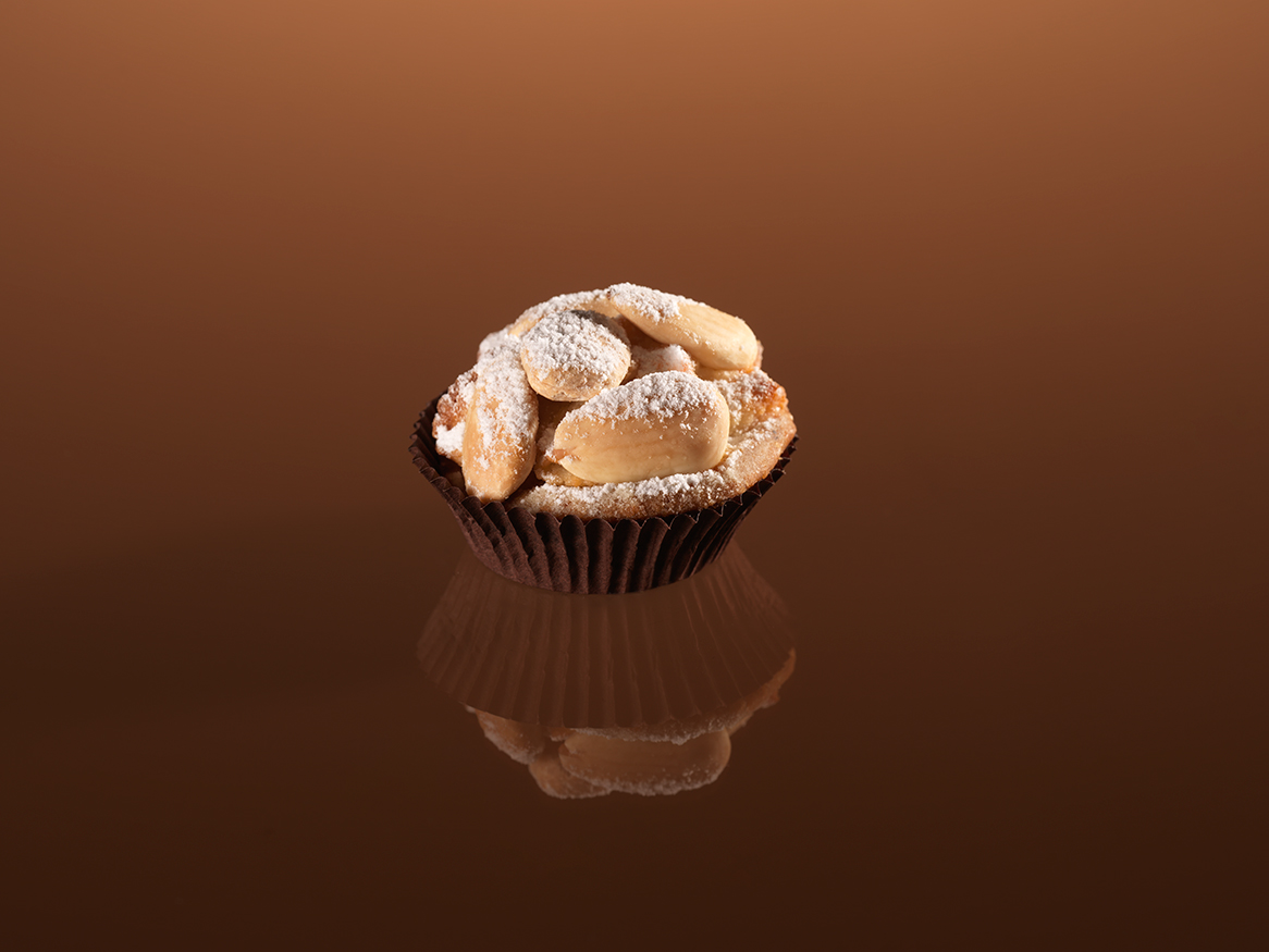 Morbida pasta di mandorle racchiusa in un piccolo cestino di pasta frolla, il tutto ricoperto da mandorle intere e una spolverata di zucchero a velo