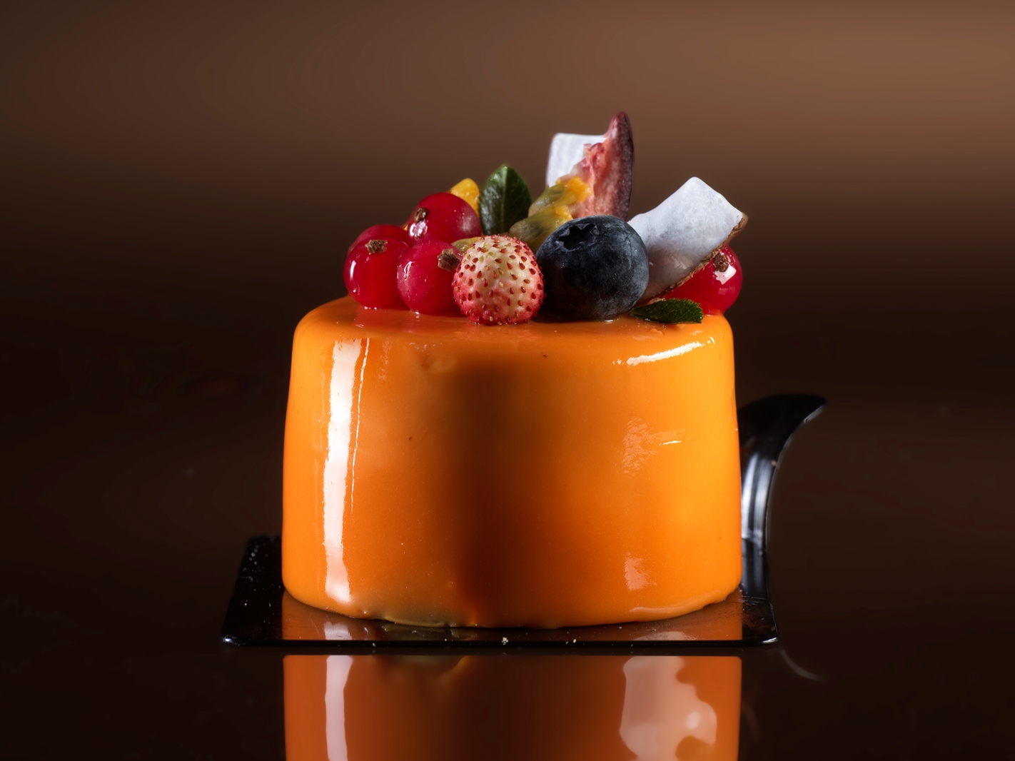 Torta moderna dal gusto esotico, una freschissima gelèe al mango e passion fruit donano il giusto tocco di acidità per equilibrare la dolcezza del cocco, il tutto racchiuso da una lucente glassa arancione a specchio