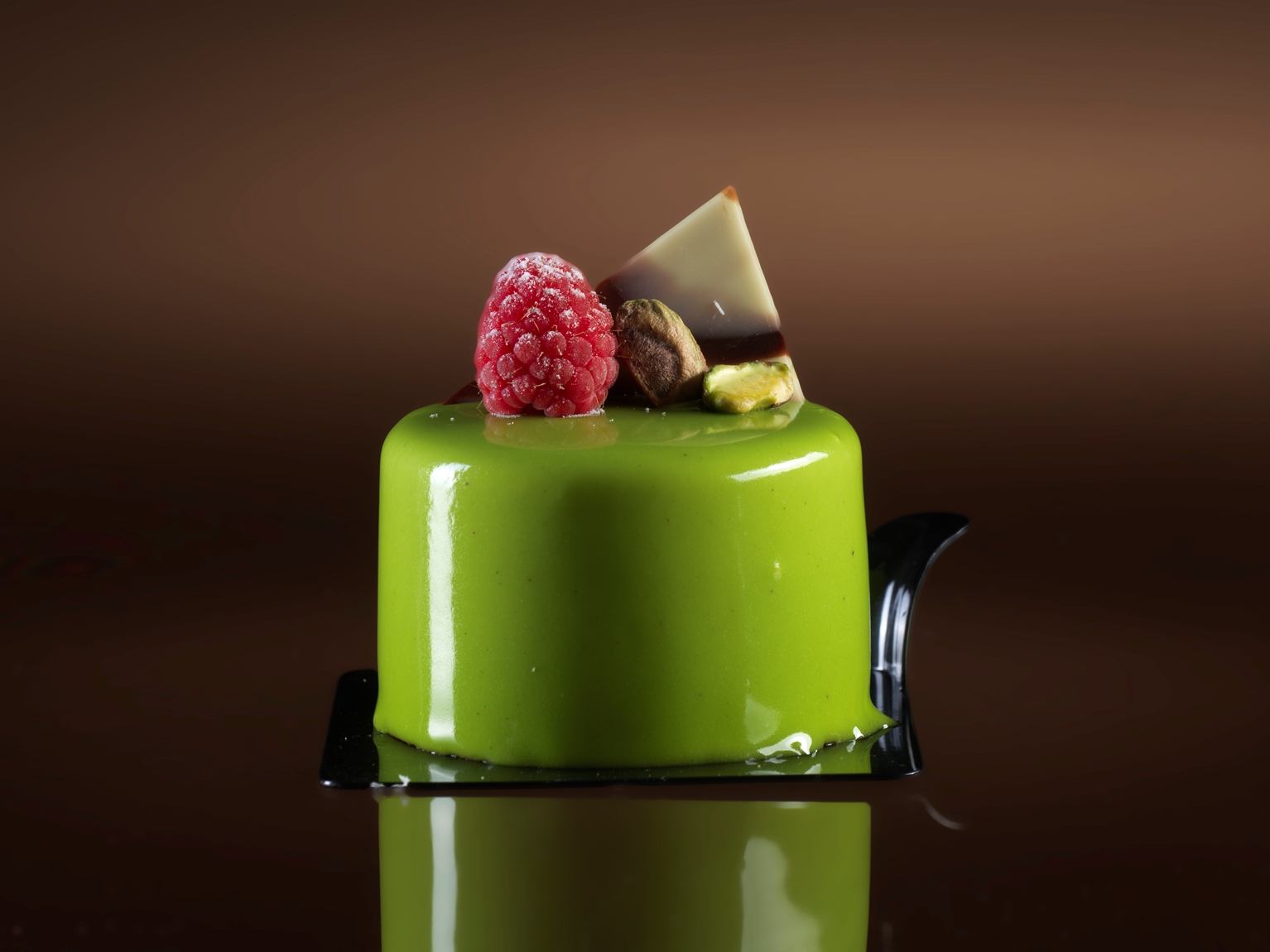 Torta moderna dal gusto deciso di pistacchio, con un inserto al lampone e un croccantino il tutto racchiuso da una lucente glassa verde a specchio