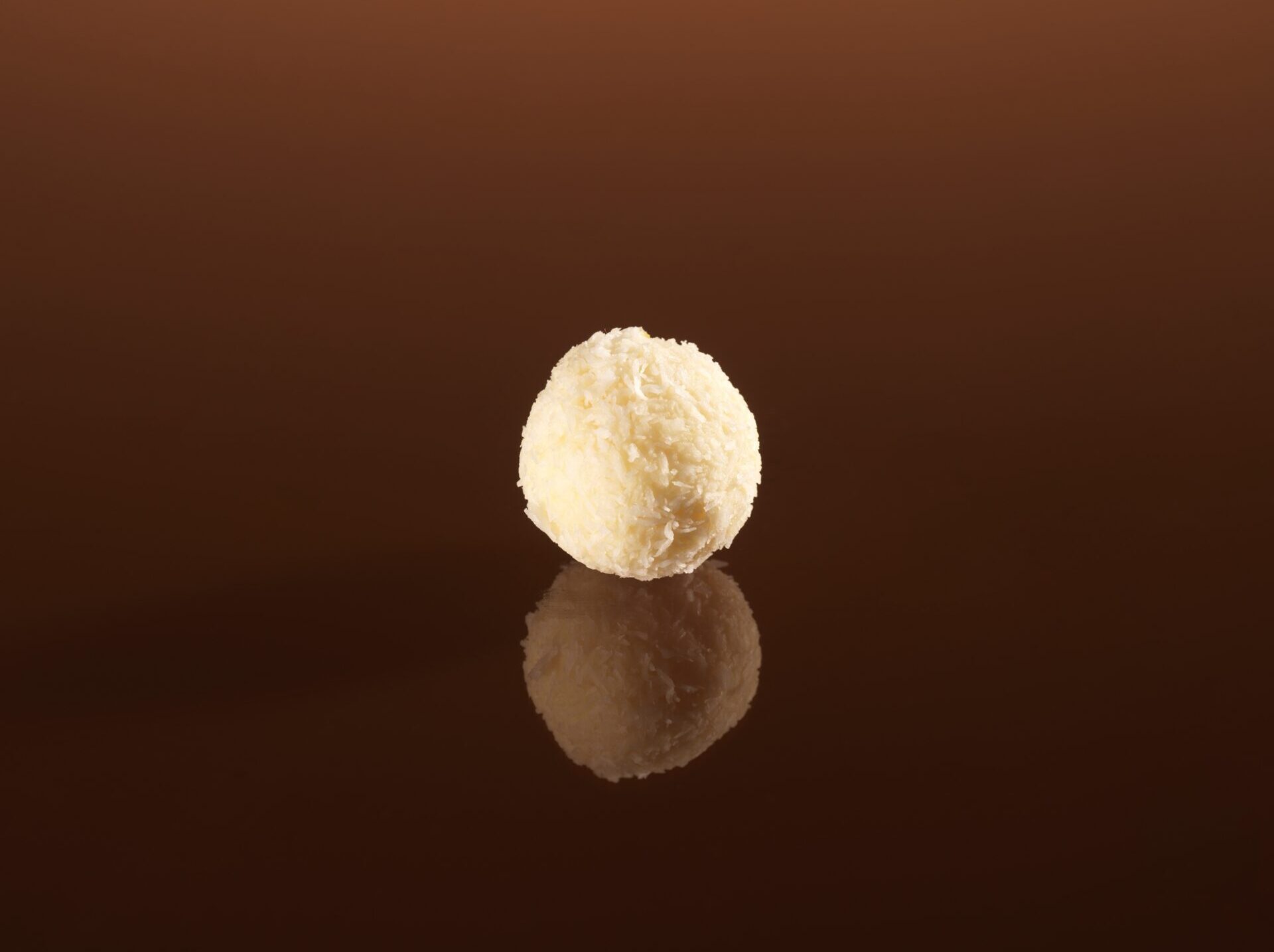 Morbida pallina al cocco e cioccolato bianco, rivestita da finissimo cioccolato bianco e una croccante polvere di cocco