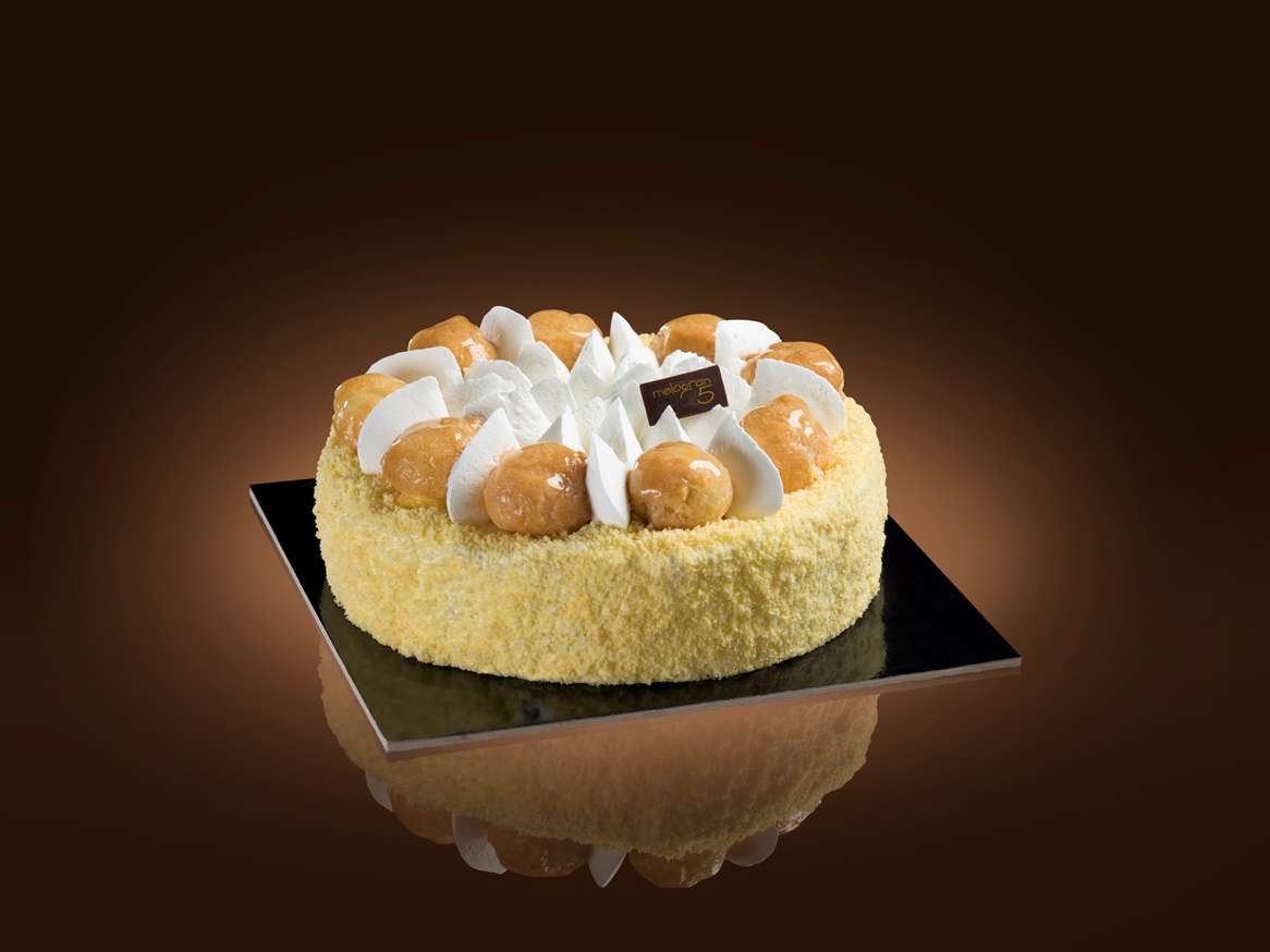 Morbida e cremosa torta con pan di spagna, arricchita da ciuffi di panna montata e golosi bignè alla crema; una delizia sia per la vista che per il gusto