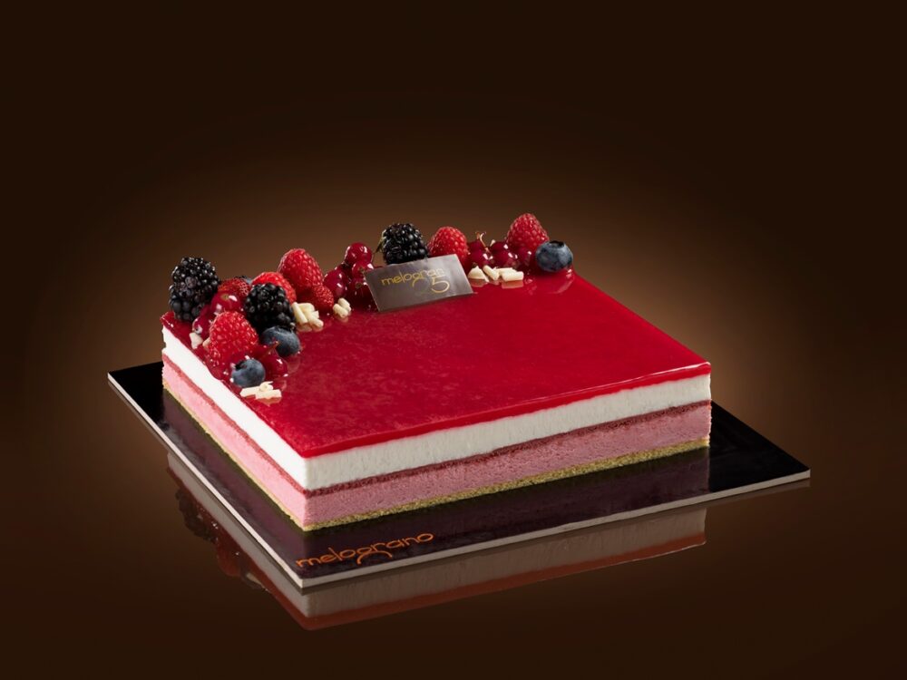 mousse frutti di bosco: (purea frutti di bosco, zucchero, albume D’UOVO, zucchero, gelatina alimentare, acqua, PANNA 38%), mousse yogurt: (YOGURT bianco intero, YOGURT scremato in polvere, LATTE scremato in polvere, ALBUME, gelatina alimentare, acqua, PANNA 38%, zucchero), gelee frutti di bosco: (purea frutti di bosco, zucchero, destrosio, gelatina alimentare, acqua), bisquit mandorla: (zucchero, farina di MANDORLE, miele, tuorlo D’UOVO, albume D’UOVO, farina senza glutine: (amido di mais, farina di grano saraceno, farina di riso, fibra di psillium zucchero)), croccantino lampone: coni senza glutine (farina di riso, zucchero, amido di mais, farina di mais, olio di semi di girasole, fibra vegetale (bambù), farina di SOIA, emulsionante: lecitina di SOIA, sale, zucchero caramellato, cacao magro in polvere, aroma naturale), cioccolato lampone: (zucchero, burro di cacao, lampone in polvere, emulsionante: lecitina di girasole, olio di semi di girasole).