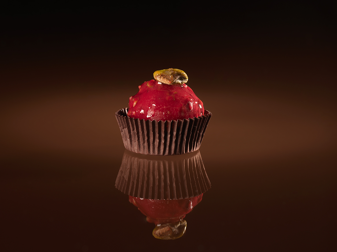 Glassa: cioccolato lampone: (zucchero, burro di cacao 35,9% , lampone in polvere 11,5% , emulsionante: lecitina di girasole), olio di semi di girasole, granella di PISTACCHIO.