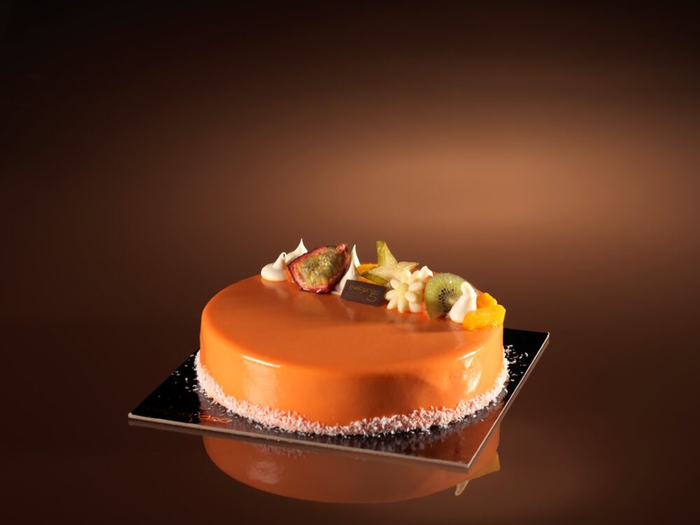 Torta moderna dal gusto esotico, una freschissima gelèe al mango e passion fruit donano il giusto tocco di acidità per equilibrare la dolcezza del cocco, il tutto racchiuso da una lucente glassa arancione a specchio