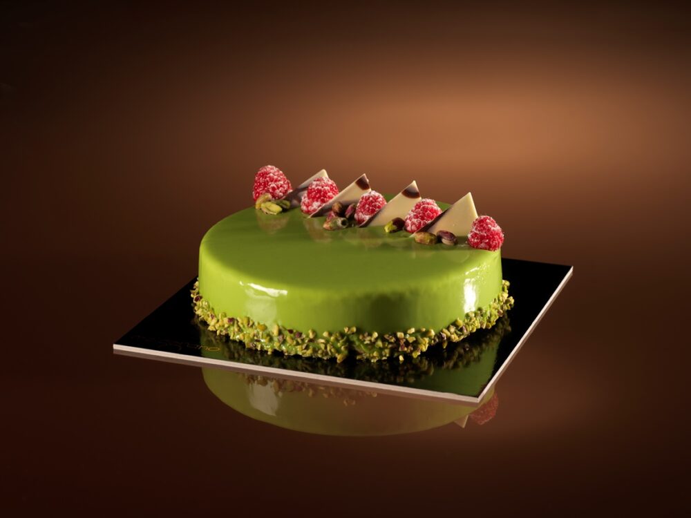 Torta moderna dal gusto deciso di pistacchio, con un inserto al lampone e un croccantino il tutto racchiuso da una lucente glassa verde a specchio